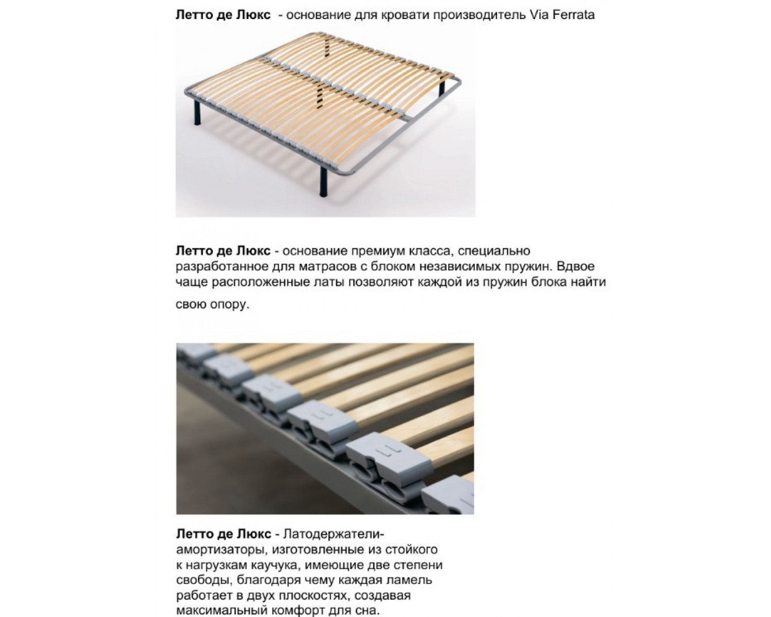 Летто де Люкс  - основание для кровати производитель Via Ferrata. Летто де Люкс - основание премиум класса, специально разработанное для матрасов с блоком независимых пружин. Вдвое чаще расположенные латы позволяют каждой из пружин блока найти свою опору.