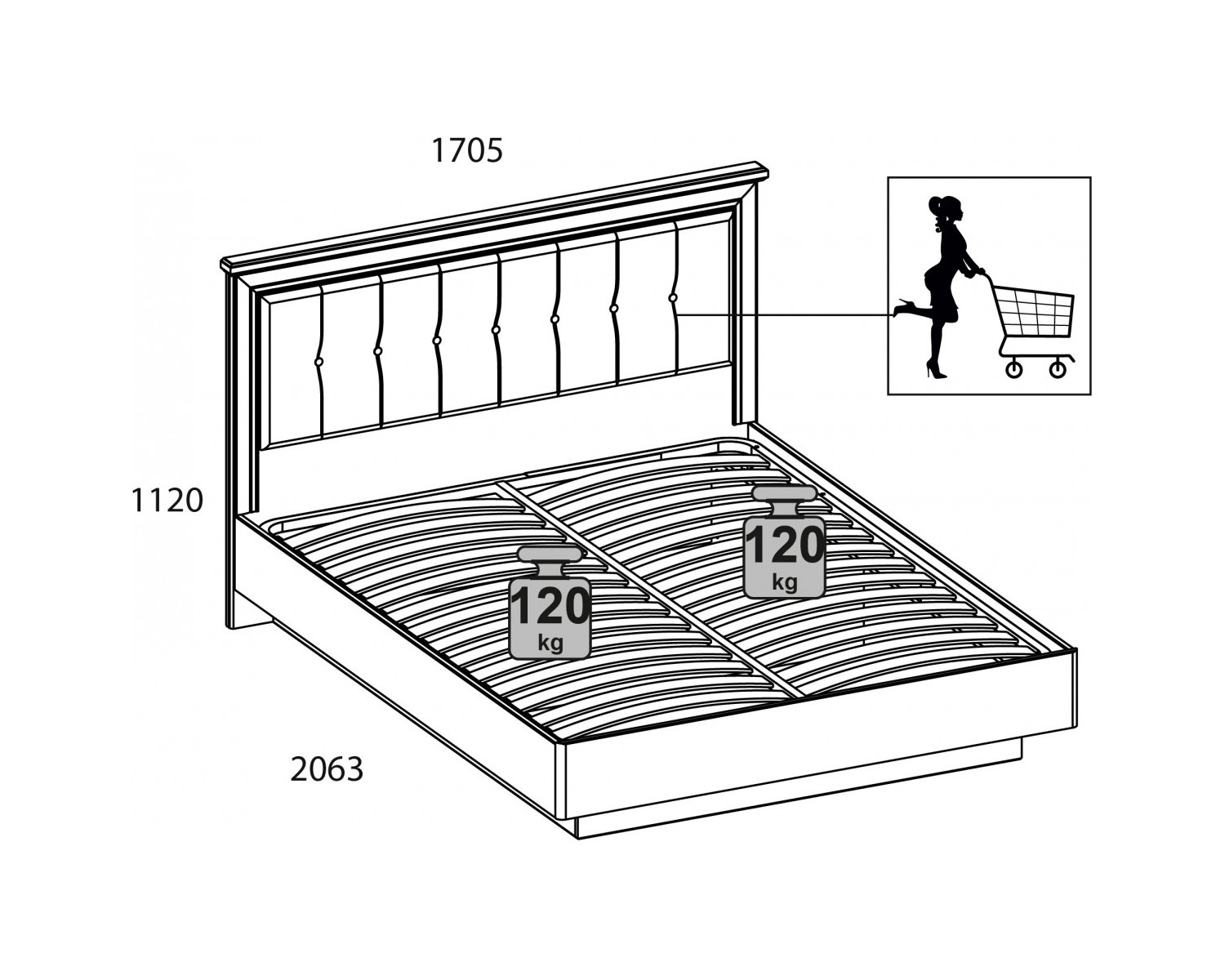Кровать 160 с ПМ SEVILLA. Кровать двуспальная, размер спального места – 1600*2000 мм (ширина – 1705 мм, высота – 1120 мм, глубина – 2063 мм). Конструкция кровати представляет собой сплошное изголовье прямоугольной формы (с планками МДФ и планкой ЛДСП в древесной текстуре) и изножье прямоугольной формы, царги и металлическое основание с подъёмным механизмом, большой вместительные короб для хранения вещей, белья и предметов быта. Деревянные ламели служат дополнительной амортизирующей основой.