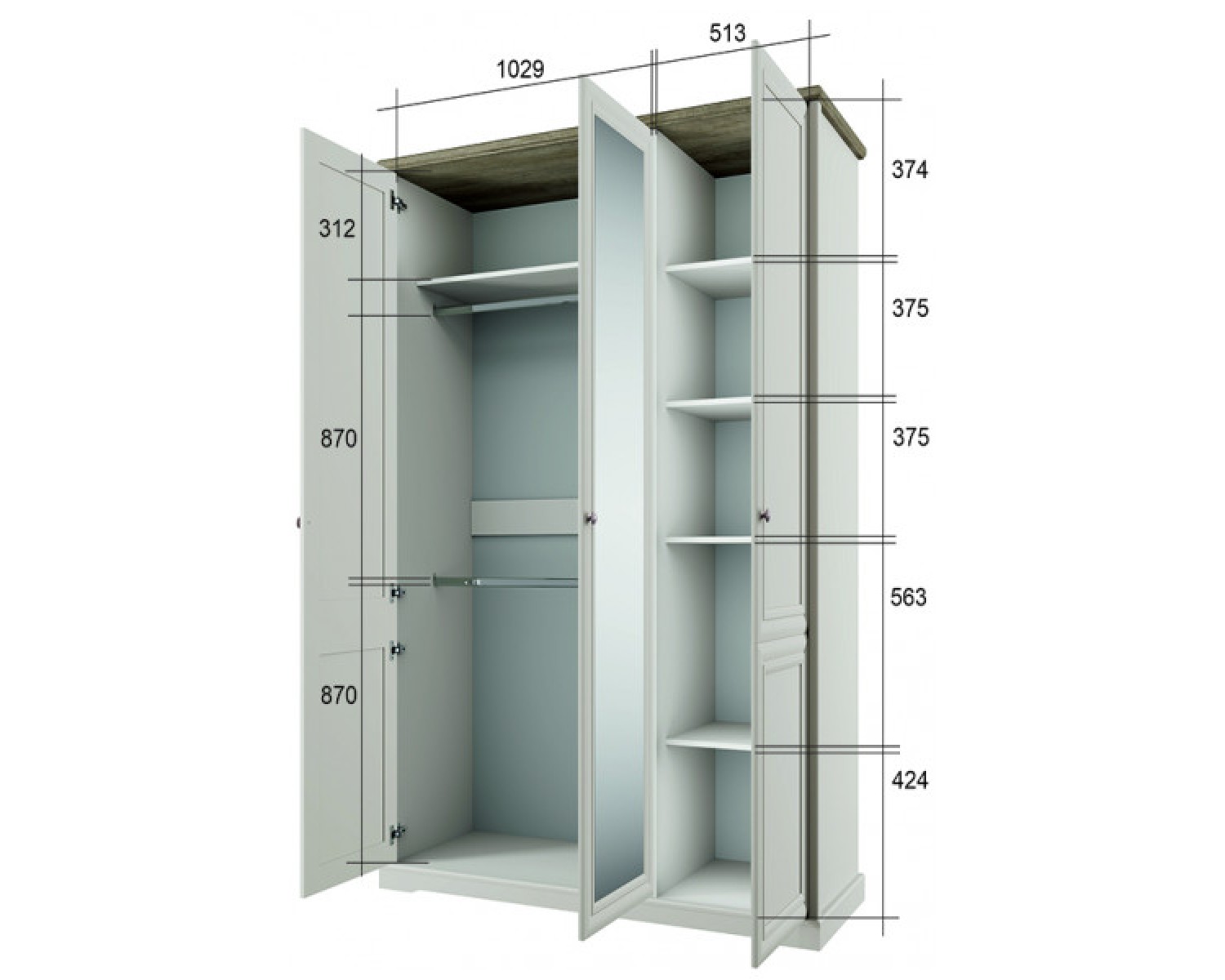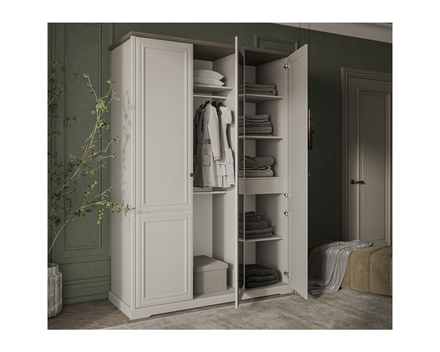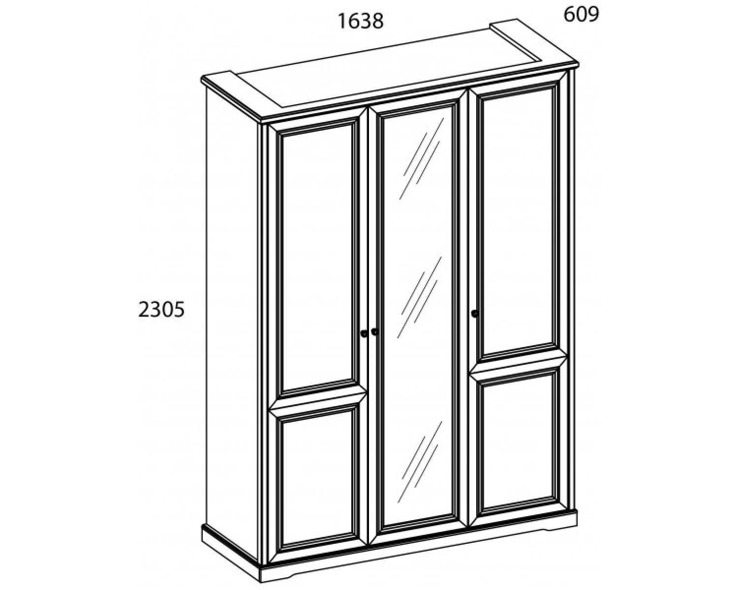 Шкаф 3DG Z TOSCANA NEW подходит для оформления небольших спален. Такой вариант может быть более функциональным и эргономичным. Конструкция шкафа 3DG Z прямая, представляет собой одно гардеробное отделение с полкой и двумя стационарными продольными штангами за двумя глухими дверями, одно отделение с полками ЛДСП за глухой дверью. Двери (3D) распашные, крепятся на петли к внутренней перегородке и боковому корпусу изделия. Особенностью элемента является использование петель с доводчиками, высота – 2305 мм, возможность докупки ящика 46.