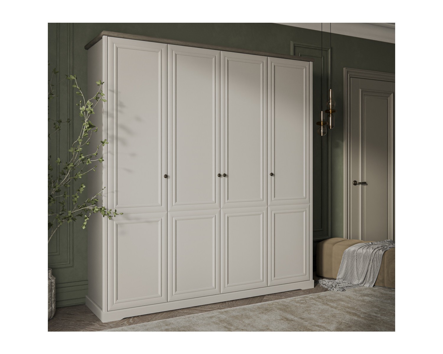 Шкаф 4DG TOSCANA NEW. Роскошный предмет мебели в классическом стиле, который украсит интерьер спальни. Конструкция шкафа 4DG прямая, представляет собой одно гардеробное отделение с полкой и двумя стационарными продольными штангами за двумя глухими дверями, два отделения с полками ЛДСП за двумя глухими дверями. Двери (4D) распашные, крепятся на петли к внутренним перегородкам и боковому корпусу изделия. Особенностью элемента является использование петель с доводчиками, высота – 2305 мм, возможность докупки ящика 46.