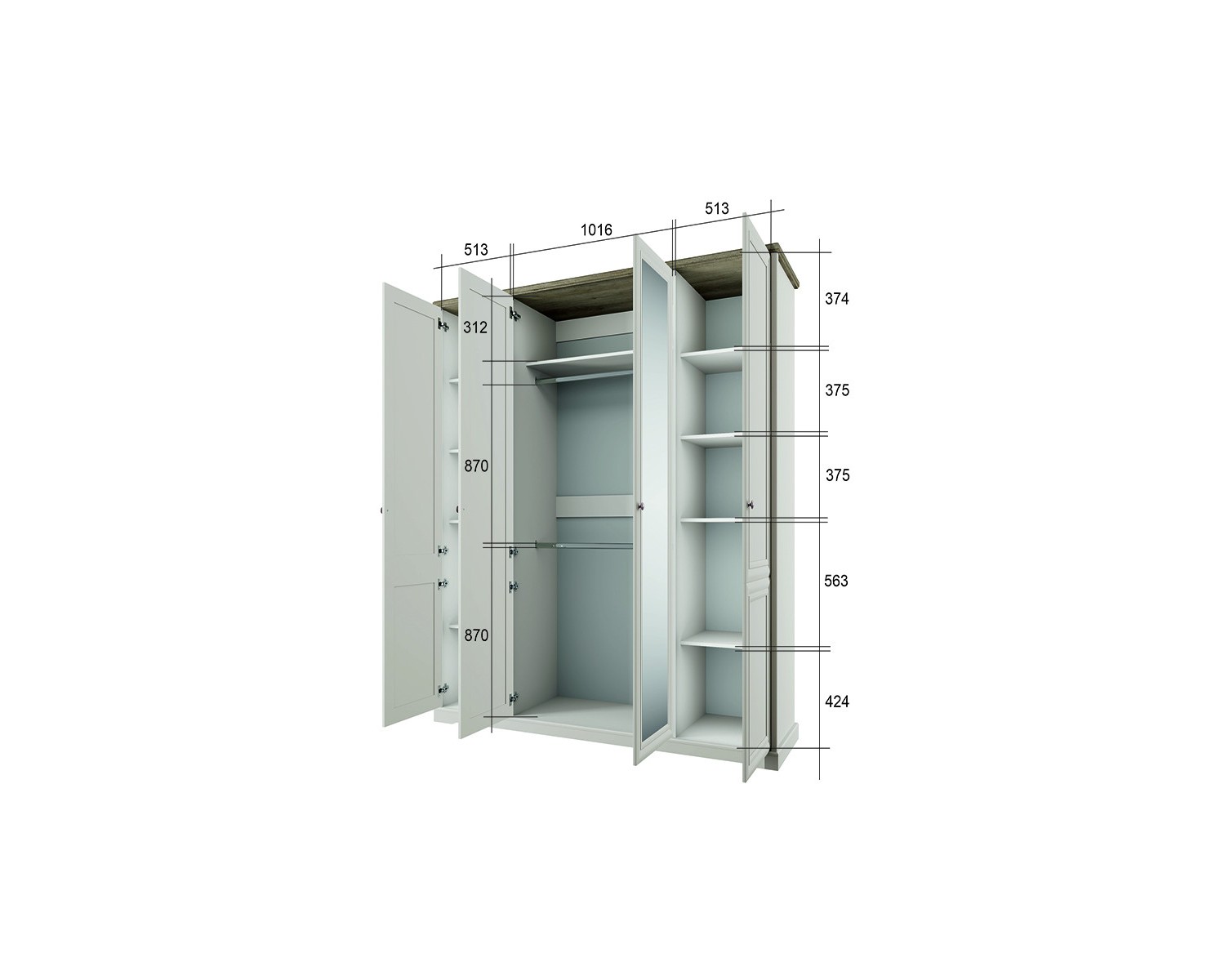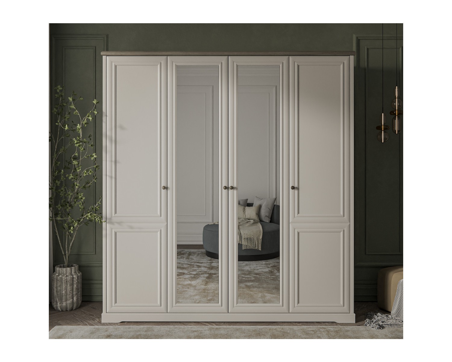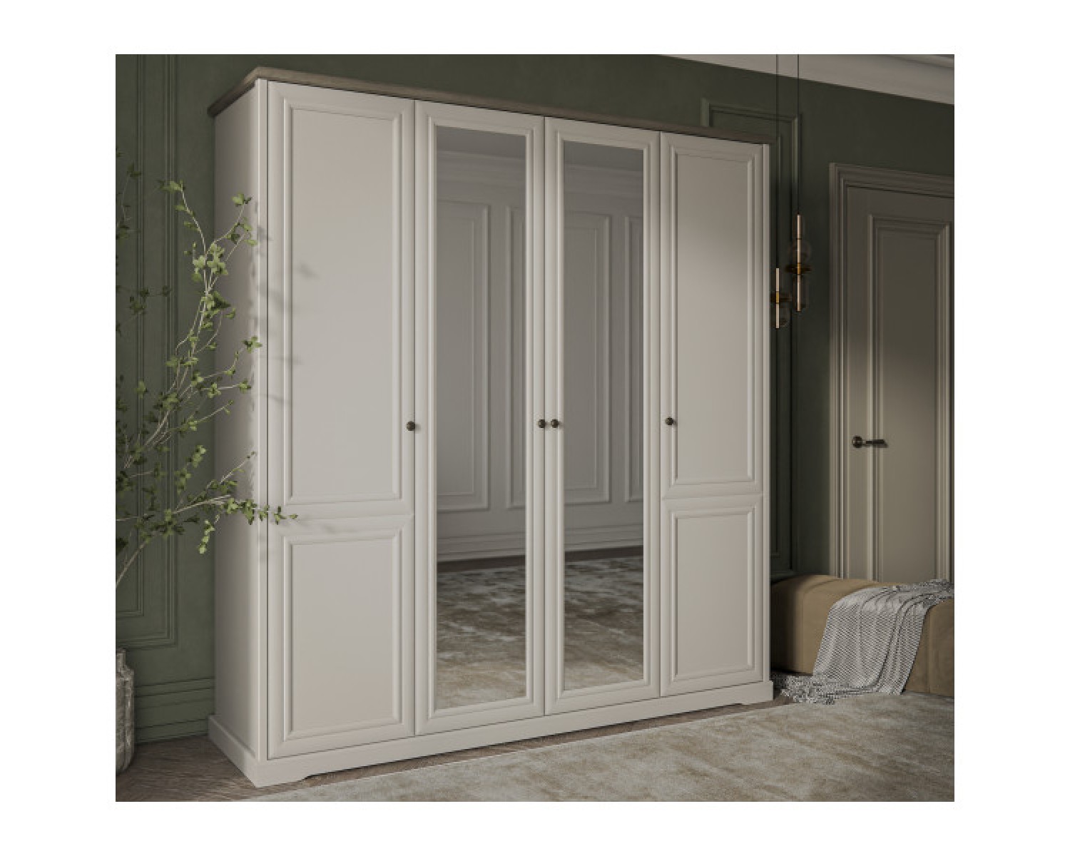 Шкаф 4DG Z TOSCANA NEW – особенный предмет мебели в спальне, который даёт широкие возможности в организации хранения. Конструкция шкафа 4DG Z прямая, представляет собой одно гардеробное отделение с полкой и двумя стационарными продольными штангами за двумя глухими дверями (на фасадах зеркала - Z), два отделения с полками ЛДСП за двумя глухими дверями. Двери (4D) распашные, крепятся на петли к внутренним перегородкам и боковому корпусу изделия. Особенностью элемента является использование петель с доводчиками, высота – 2305 мм, возможность докупки ящика 46.