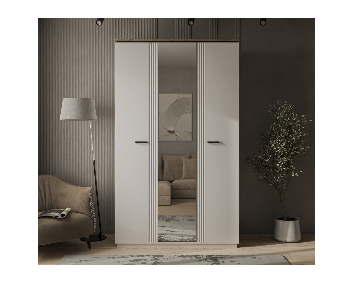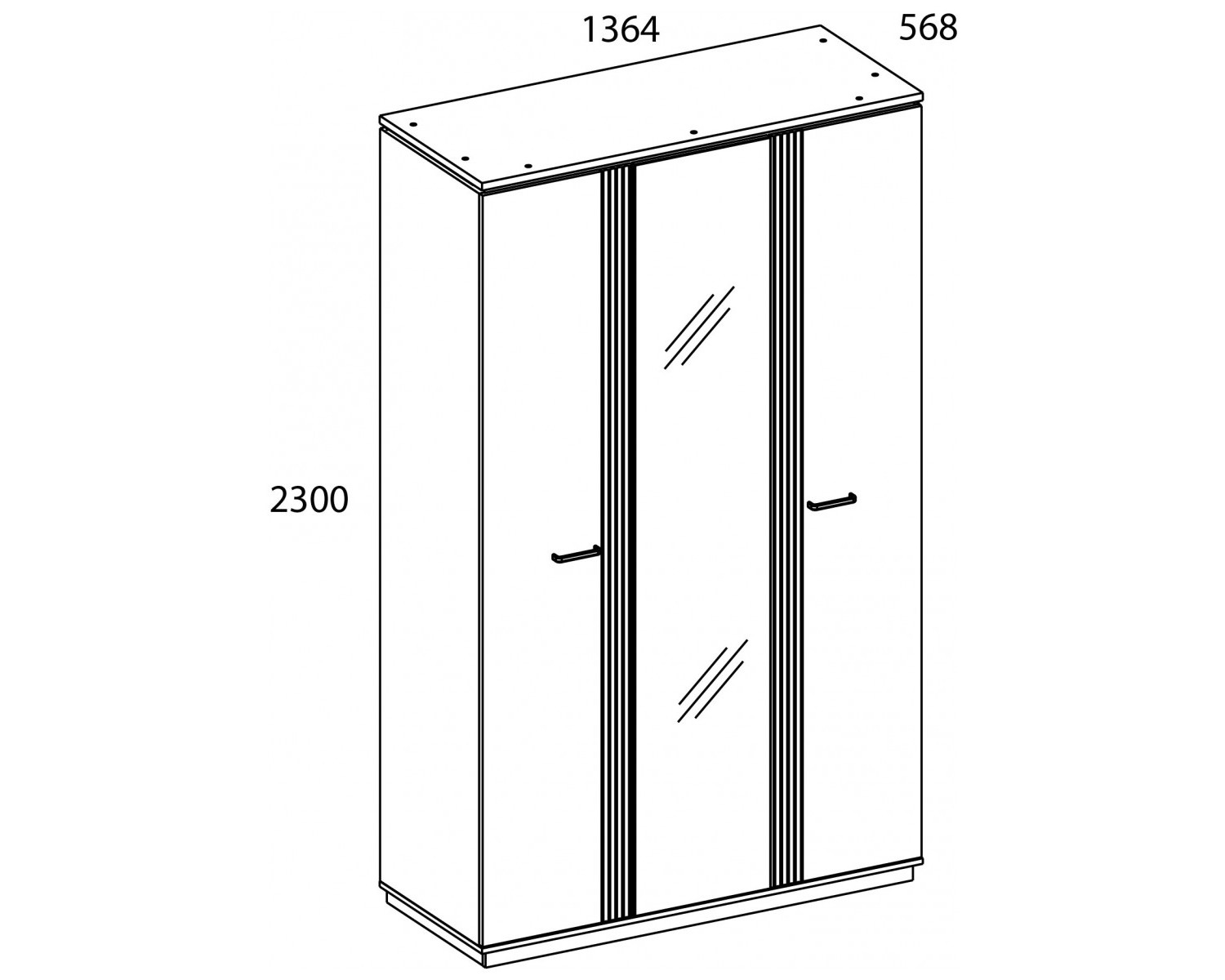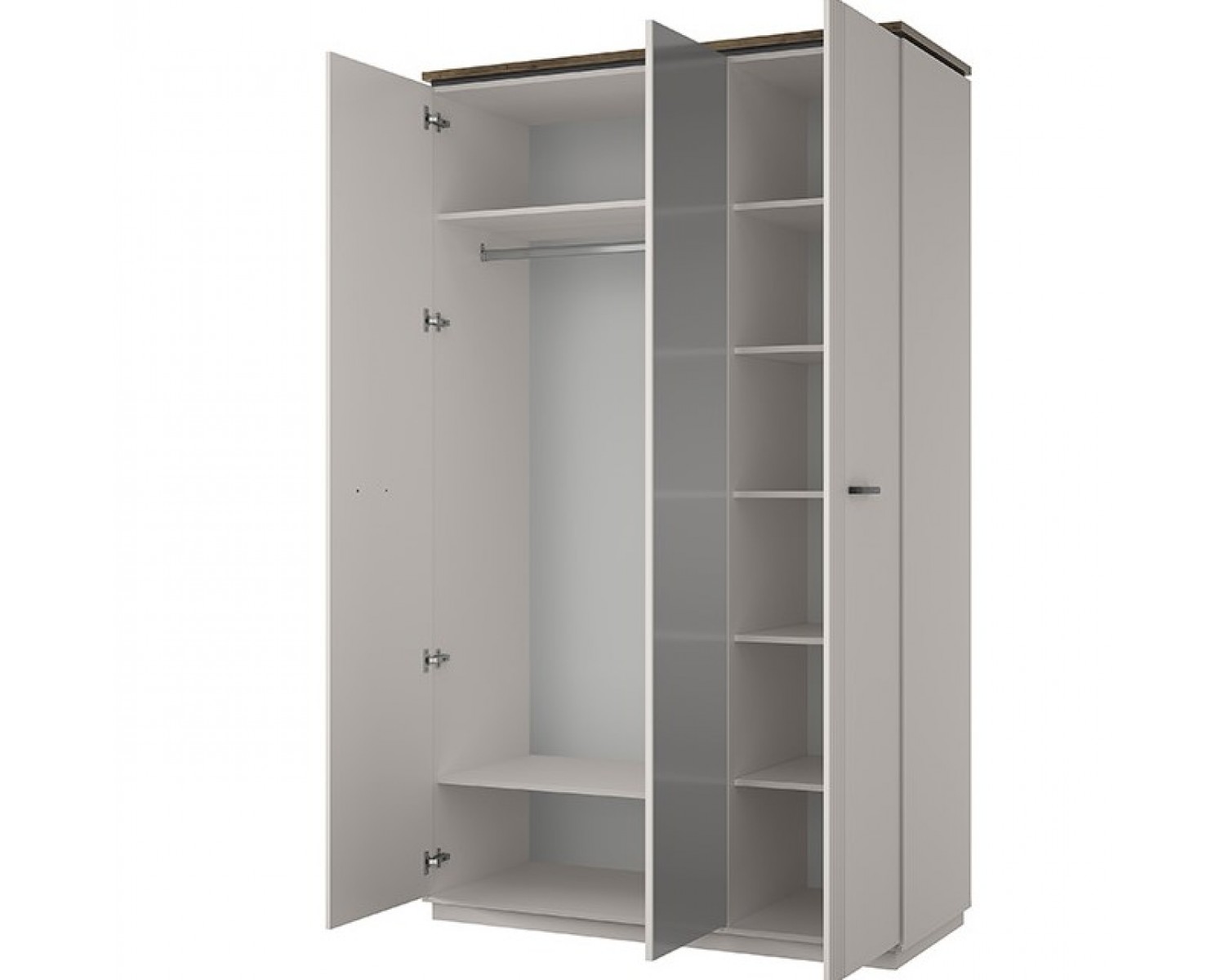 Шкаф 3DG Z VINATI – представитель трёхдверных распашных шкафов, который позволяет максимально использовать внутреннее пространство. В отличие от шкафа 4DG2S Z VINATI, шкаф 3DG Z имеет увеличенное гардеробное отделение, так как по конструкции не представлены выдвижные ящики. Конструкция шкафа 3DG Z VINATI прямая, представляет собой одно отделение с полками за глухой дверью, одно гардеробное отделение с двумя нишами и стационарной продольной штангой за двумя глухими дверями. Двери (3D) распашные, крепятся к внутренней перегородке и боковому корпусу изделия. Особенностью элемента является эстетический внешний вид, комплектация петлями с доводчиками, высота – 2300 мм. На среднюю дверь снаружи крепится зеркало.