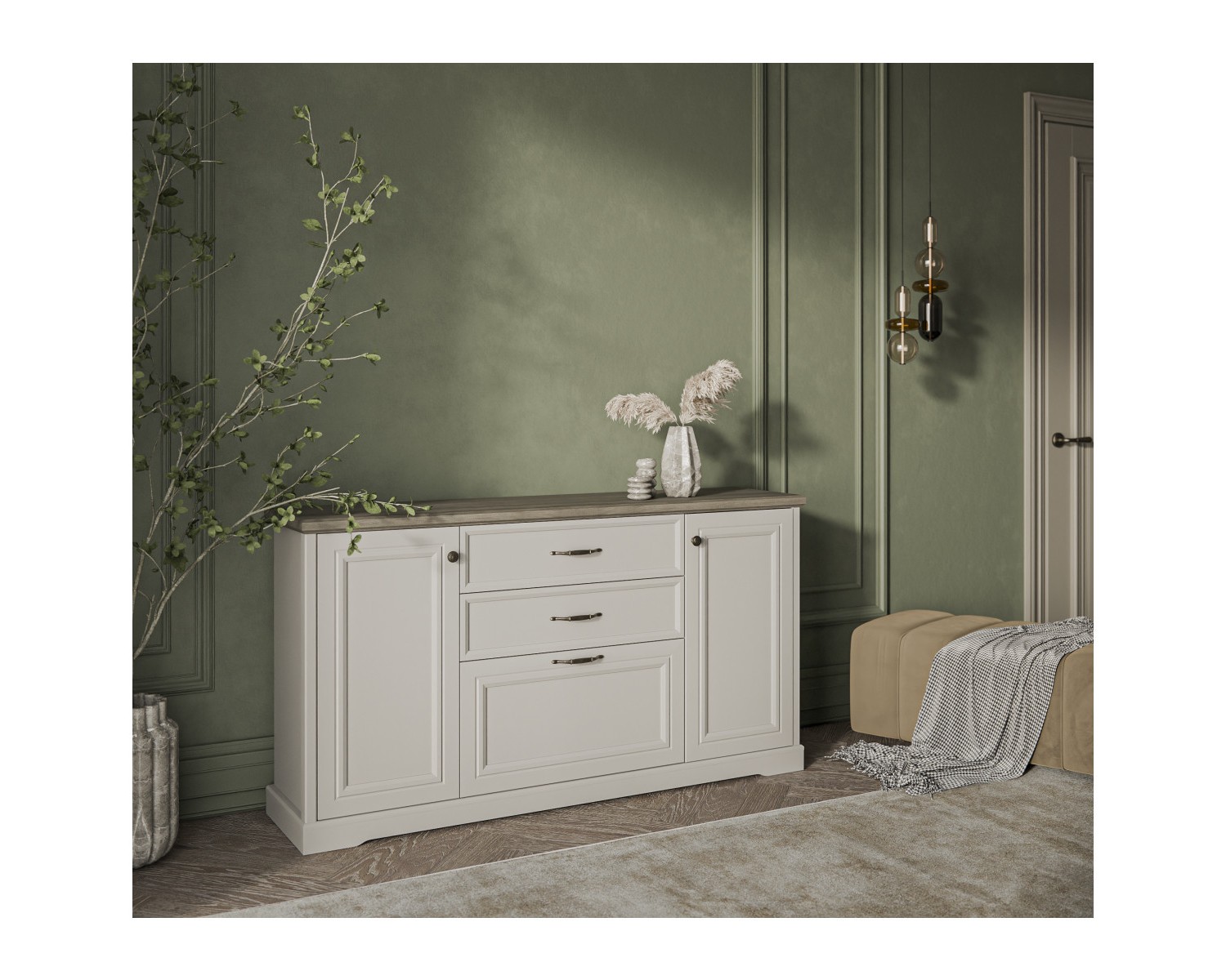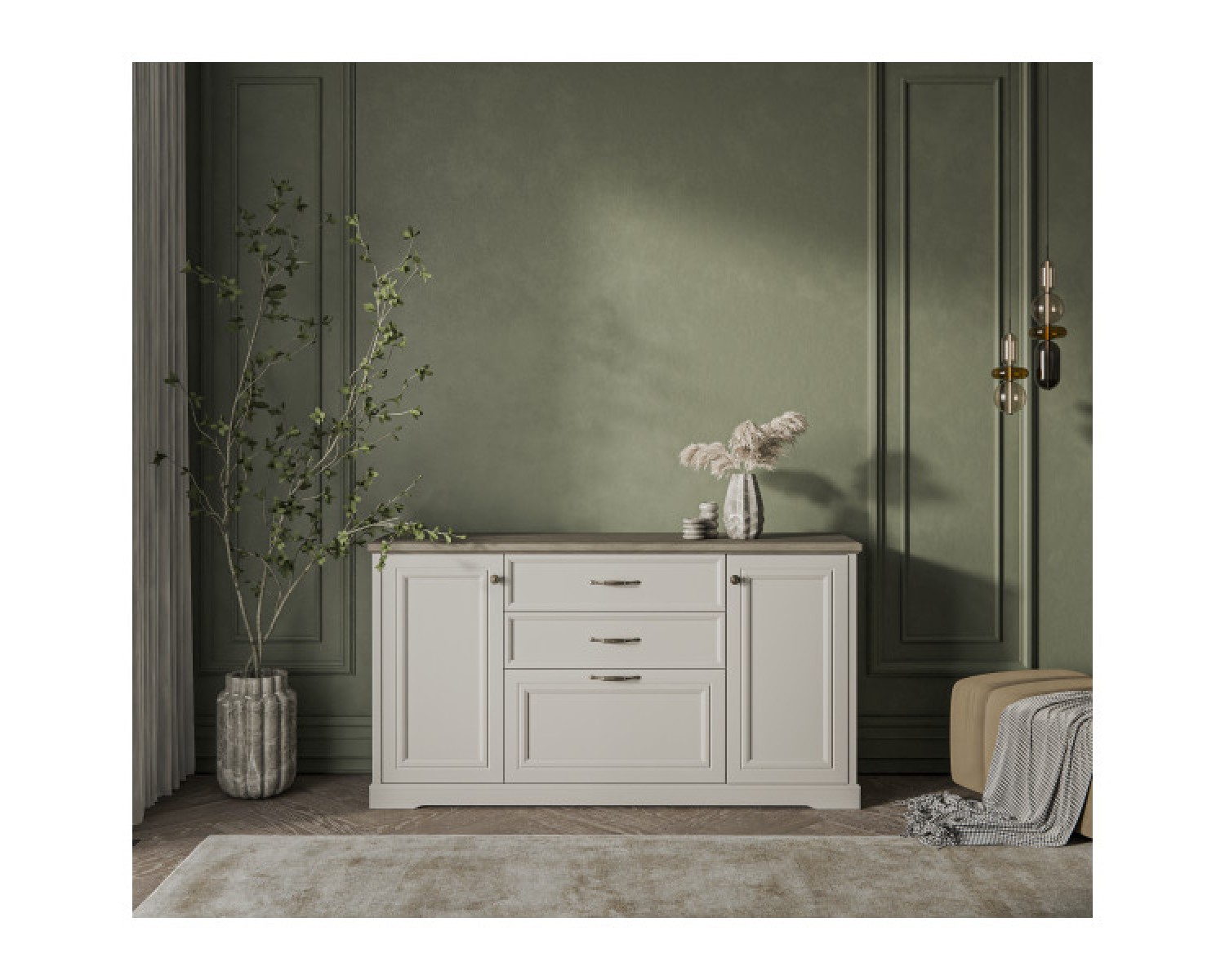 Материал: рамочно-филенчатая конструкция глухого фасада, рамка МДФ – 19 мм, филенка ЛДСП – 8 мм, цвет – персидский жемчуг 810 PO; фасады выдвижных ящиков – ЛДСП (16 мм - основа), МДФ (9 мм - планка), цвет – персидский жемчуг 810 PO.