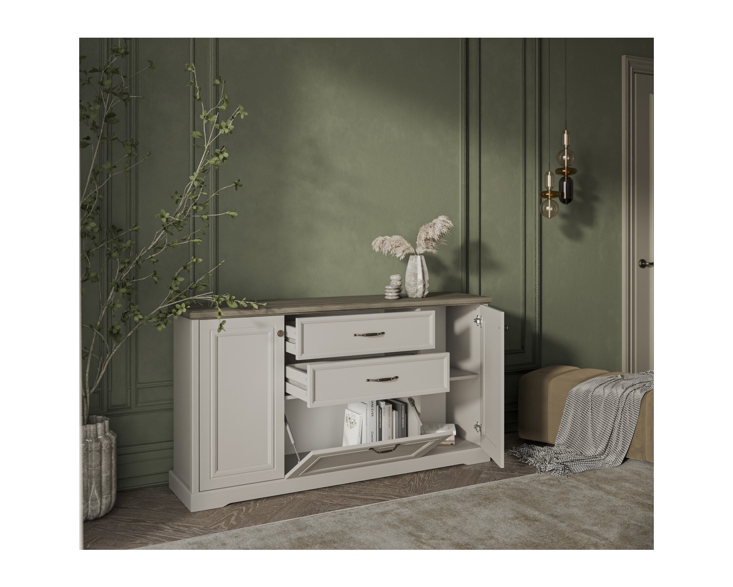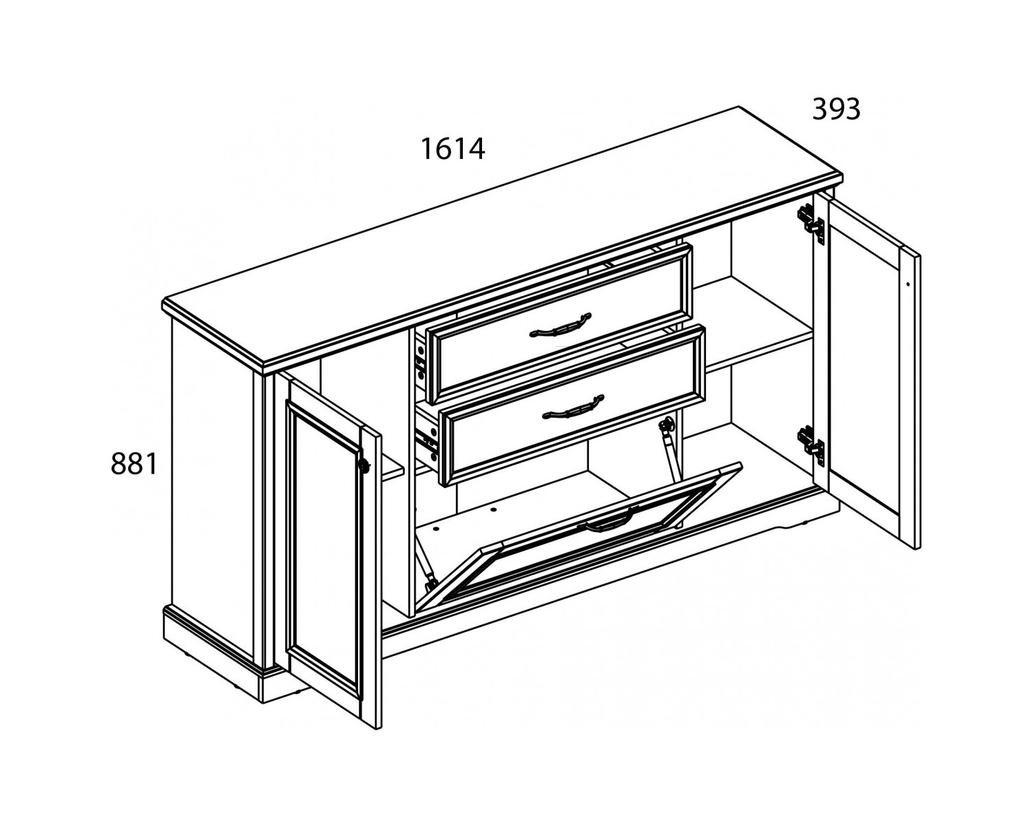 Тумба 3D2S-1 TOSCANA NEW. Оригинальный дизайн элемента подчеркнёт элегантность и аристократичность интерьера. Конструкция тумбы 3D2S-1 прямая, представляет собой два отделения с полками ЛДСП за двумя глухими дверями, одно отделение за откидной дверью, два выдвижных ящика (2S). Данный элемент мебели универсален и может оформить любую по функционалу комнату. Две двери распашные, одна откидная, крепятся на петли и газлифты к боковому корпусу изделия. Особенностью модели является дизайн, использование петель и направляющих с доводчиками.