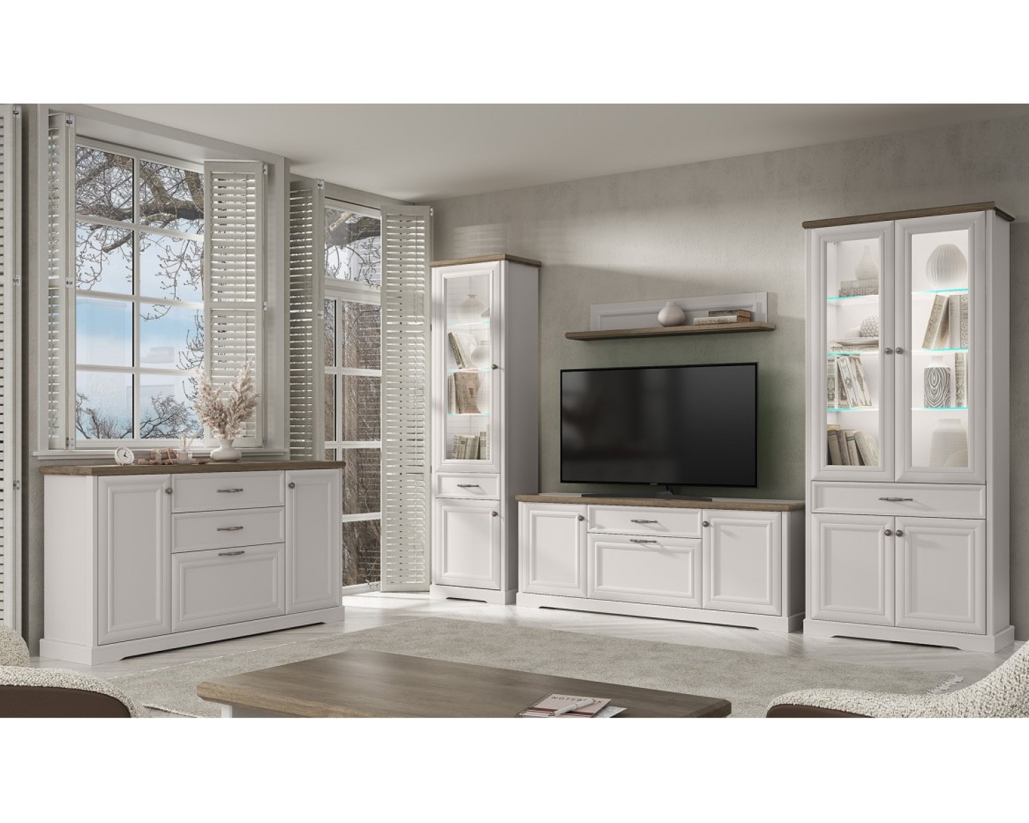 Гостиная TOSCANA Вариант 1 (2+тв+1) ПЕРСИДСКИЙ ЖЕМЧУГ/КАНЬОН - современная коллекция в классическом стиле для организации гостиной и спальной группы. Особенностью мебели является выбор контрастных текстур - дуб каньон и персидский жемчуг, декоративные планки на фасадах, утолщение верхних щитов, широкий выбор модулей для организации любой по площади комнаты, использование петель и шариковых направляющих с доводчиками.