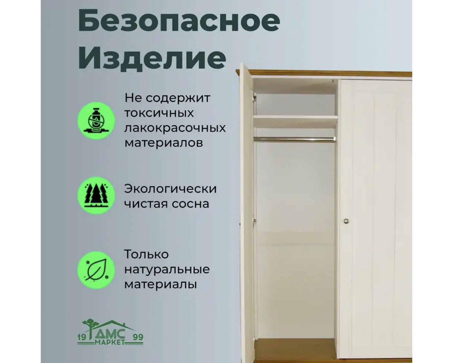 Экологичностью: изготовлен из массива сосны, покрыт сертифицированными лаками шведской фирмы Becker Acroma на водной основе с натуральным пчелиным воском. Красители без резкого запаха, стойкие и неаллергенные.
