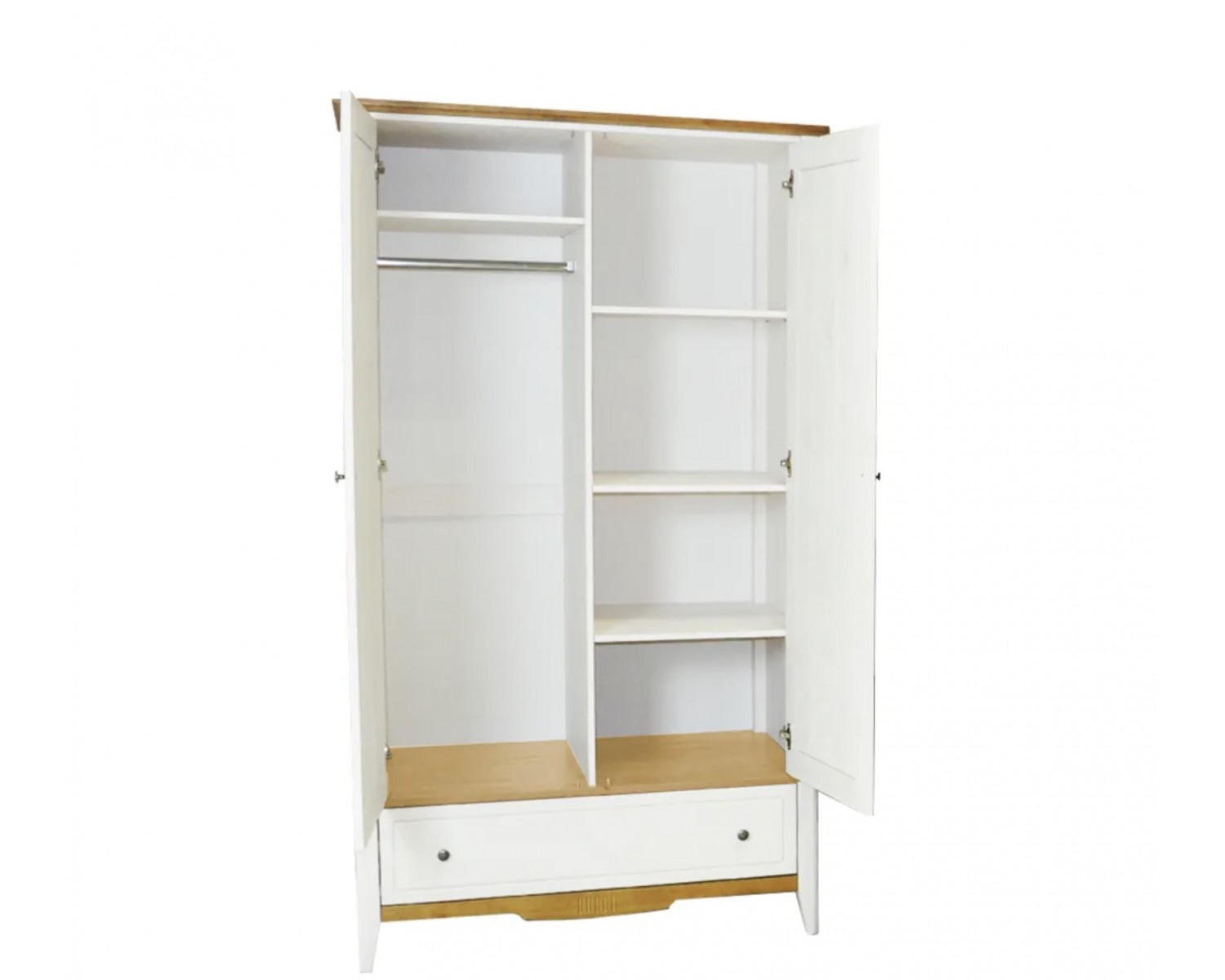 Шкаф комбинированный двухстворчатый 21 Пенни белый воск/антик 24 выполнен в скандинавском стиле, без броского декора, подойдет и для спальни, и для гостиной. Если есть место, то можно поставить его и в прихожей как шкаф для верхней одежды.
