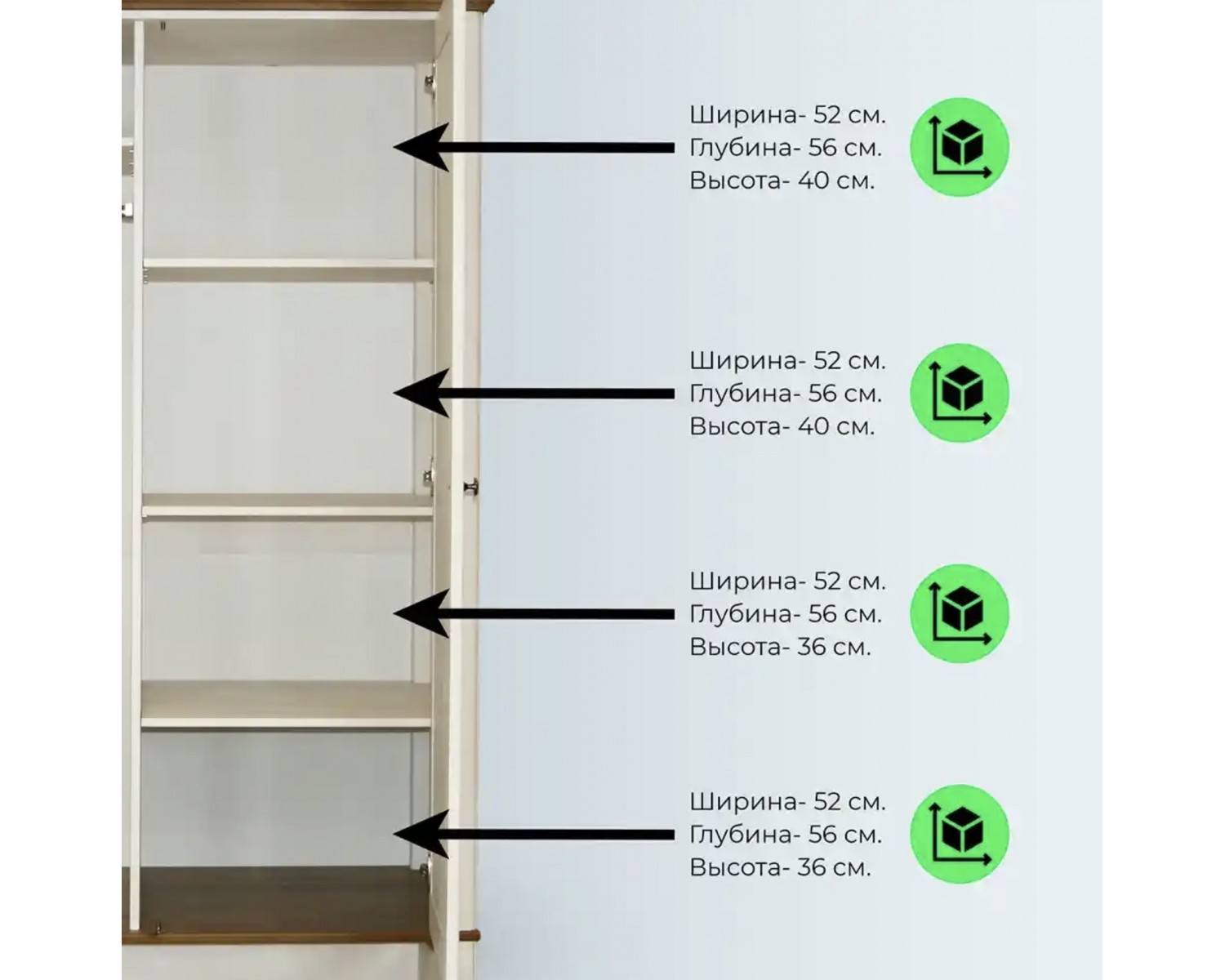 Удобной конструкцией: шкаф двухсекционный, справа три полки с регулировкой по высоте. Слева отделение со штангой для одежды и полкой сверху. Дверные петли с доводчиками Hettich для плавного закрывания. Внизу один широкий ящик на шариковых направляющих частичного выдвижения, без доводчиков. Высота от пола до нижней декоративной планки 12 см, под шкафом пройдет робот-пылесос.