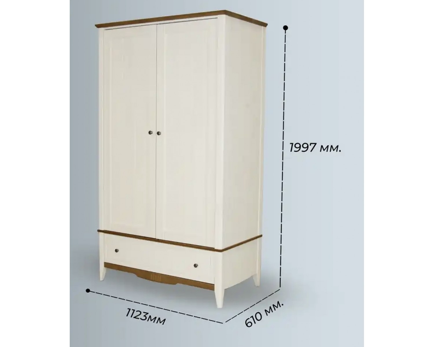 Оригинальным дизайном: корпус шкафа в белом цвете, а карниз, перекрытие между основным отделением и ящиком и нижняя декоративная планка в цвете антик, через покрытие антик видна текстура сосны. Можно заказать эту же модель шкафа в отделке «серый/антик». Фасады украшены фрезеровкой, в комплекте металлические ручки-кнопки с искусственным старением. Дно ящика изготовлено из ламинированного белого оргалита, стенки ящика сделаны из массива сосны, выкрашены в цвет корпуса.