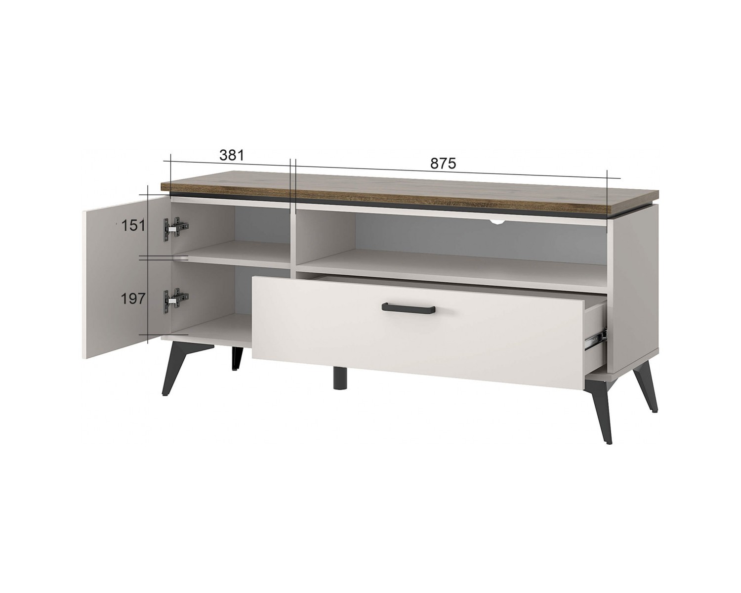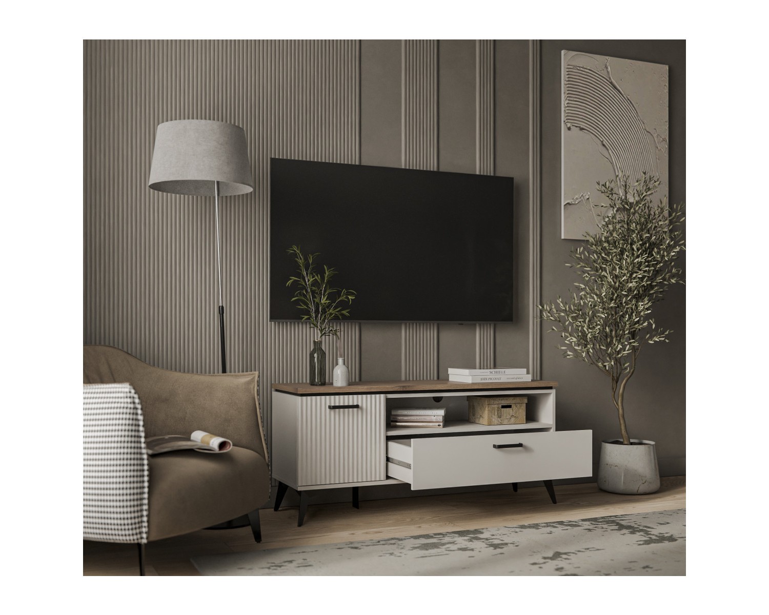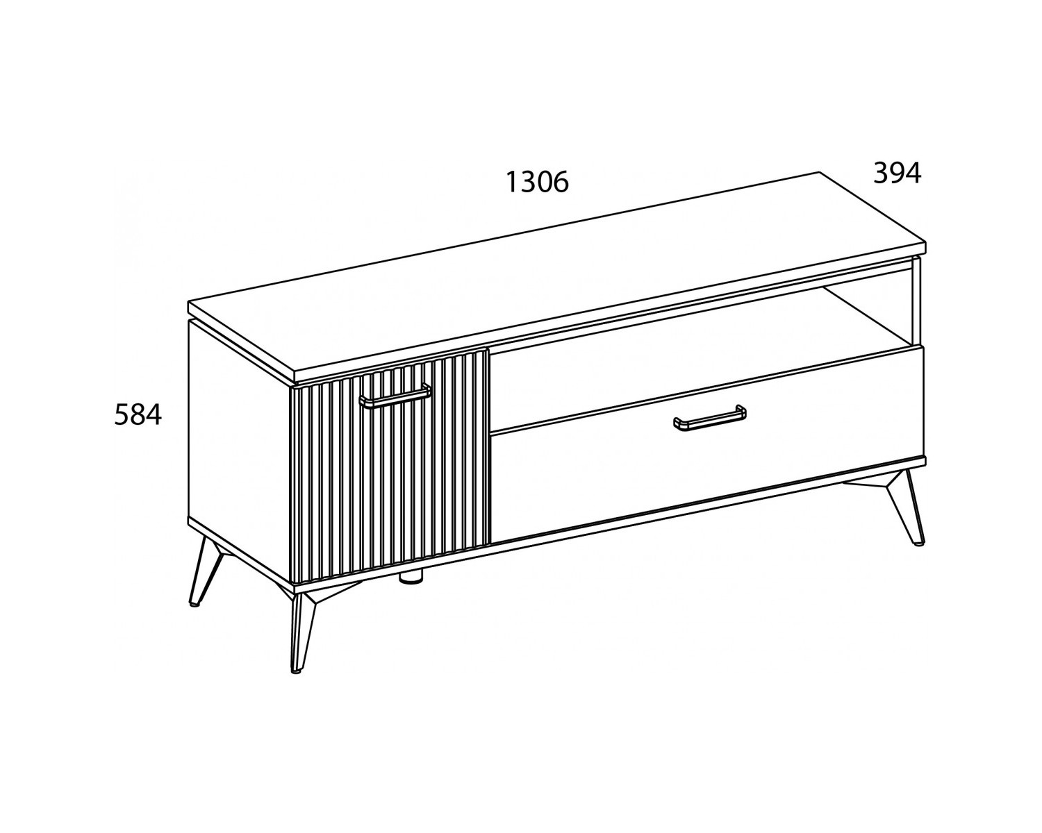 Тумба RTV 1D1SN VINATI. Если модель сравнивать с тумбой RTV 2D1SN VINATI, сокращена ширина – 1306 мм. Подойдёт для оформления гостиной с небольшой площадью. Может быть установлен как самостоятельный предмет мебели, так и в композиции с другими элементами коллекции VINATI. Конструкция тумбы RTV 1D1SN VINATI прямая, представляет собой одно отделение за глухой распашной дверью (1D), один выдвижной ящик (1S), одну открытую нишу (N). Дверь (1D) распашная, крепится на петли к боковому корпусу изделия.