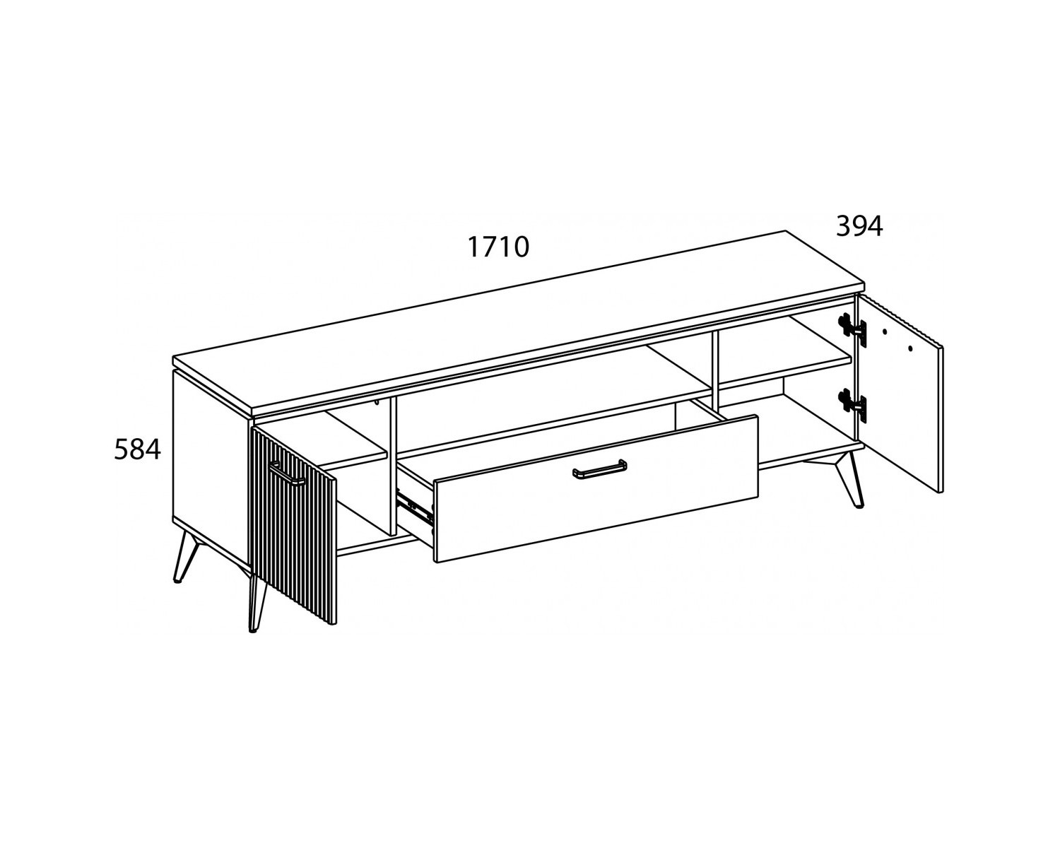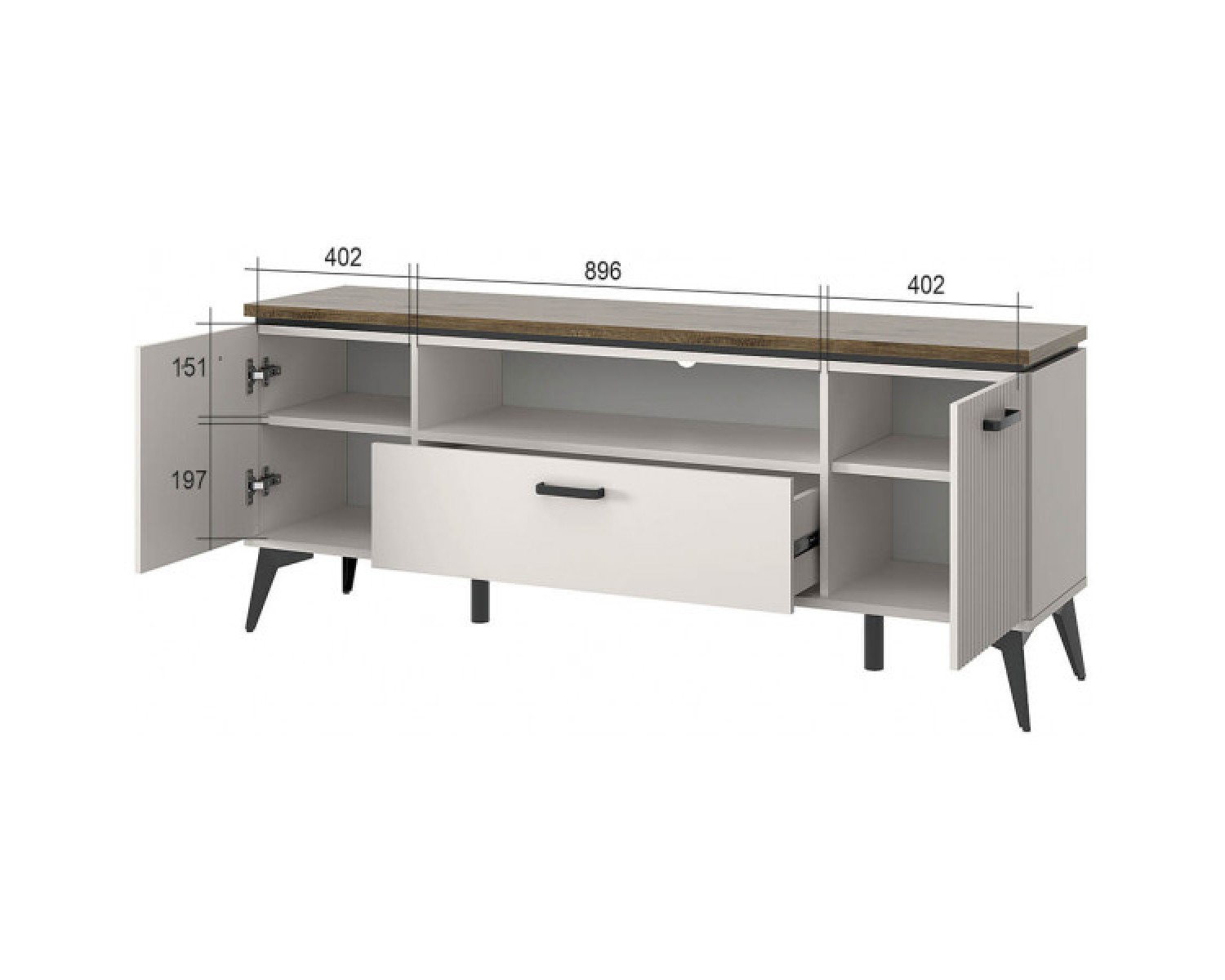 Тумба RTV 2D1SN VINATI. Оформление ТВ-зоны, которая акцентирует внимание – основная задача тумбы RTV. Данная модель, за счёт своей ширины, предназначена для помещений с большой площадью. Предмет мебели таких габаритов и с ярко выраженными деталями (ручки и опоры в цвете чёрный), способен самостоятельно задать характер и стилистику интерьера. Конструкция тумбы RTV 2D1SN VINATI прямая, представляет собой два раздельных отделения за глухими дверями (2D), один выдвижной ящик (1S), одну открытую нишу над ящиком (N) для организации дополнительной техники. Двери распашные, крепятся на петли к боковому корпусу изделия.