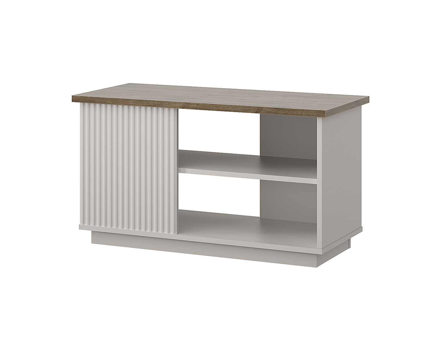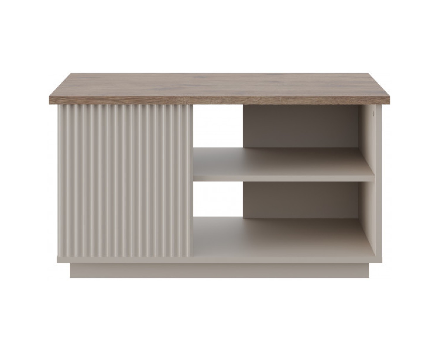Стол журнальный VINATI – оригинальная конструкция элемента выделит индивидуальность интерьера гостиной. Стол журнальный имеет прямую конструкцию. Конструкция представляет собой столешницу прямоугольной формы в древесной текстуре, которая соединяется с нижним щитом посредством вертикальных панелей из ЛДСП и МДФ; предусмотрен цокольный пояс.