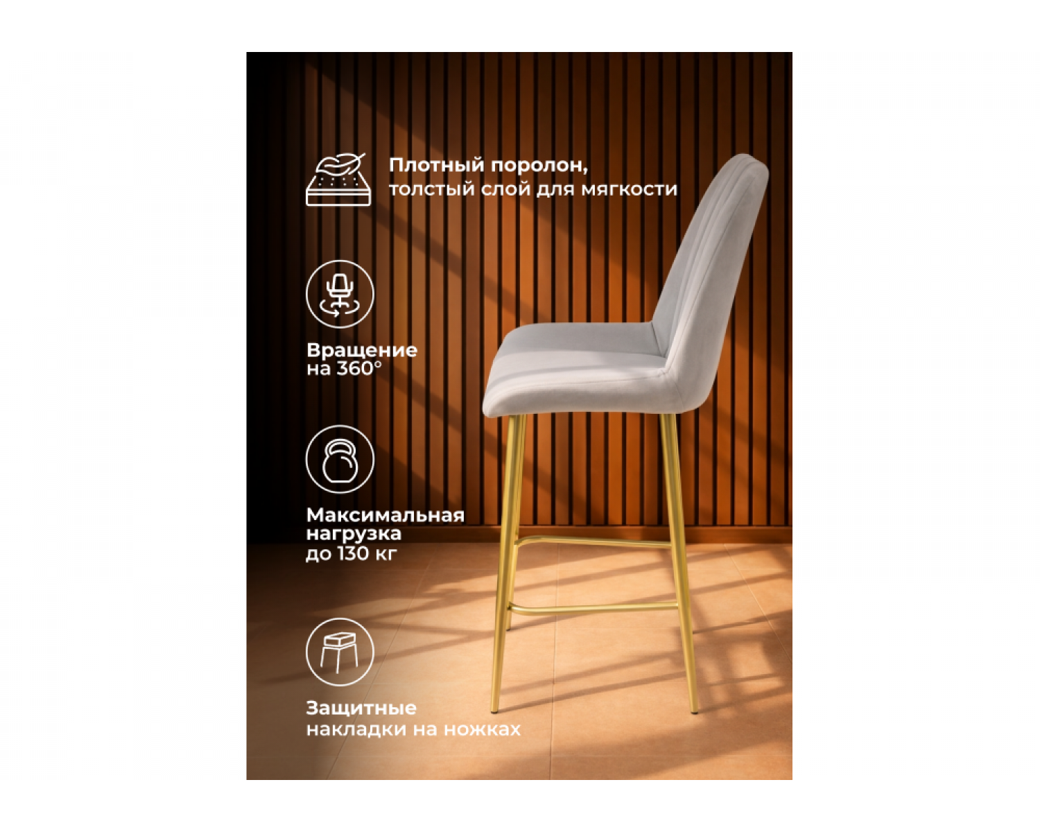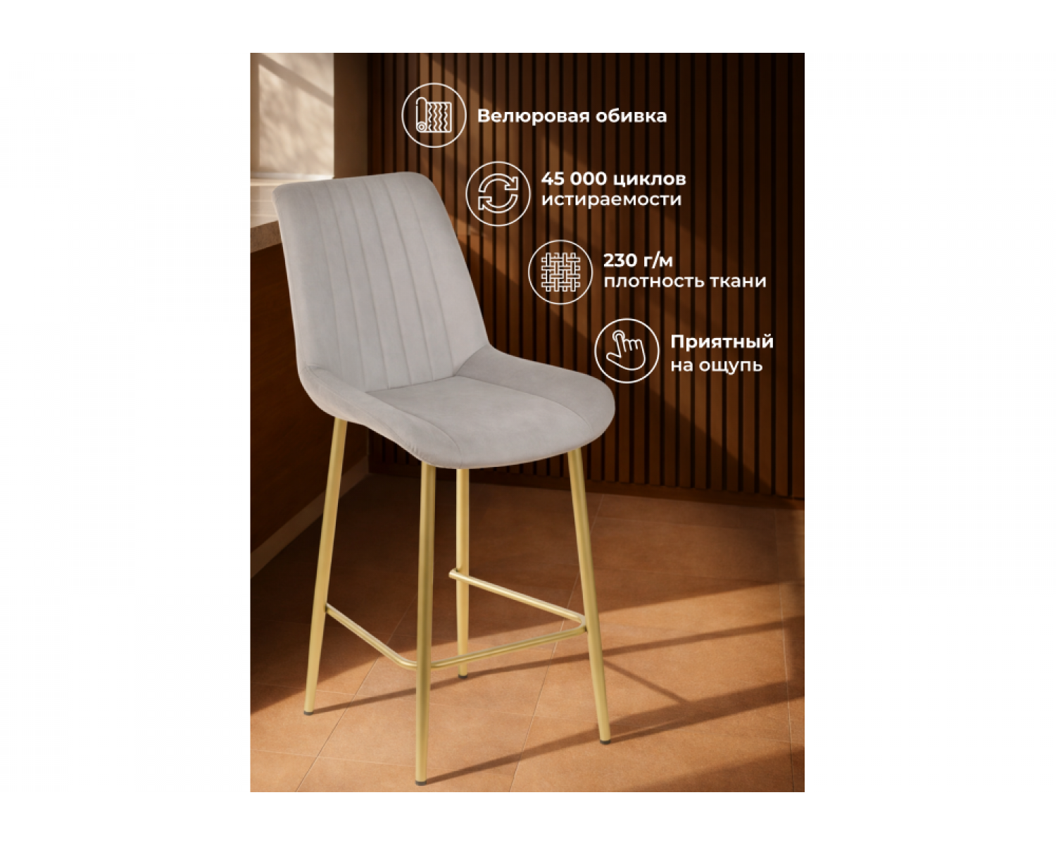 • Элегантный внешний вид: Мягкое велюровое сиденье в сочетании с элегантными ножками создает атмосферу уюта и роскоши.