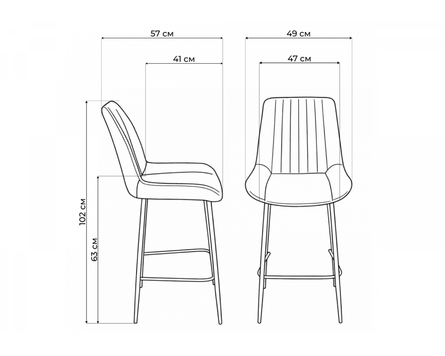• Продуманная эргономика: Ширина сиденья 47 см и глубина 41 см обеспечивают комфортное размещение, а высота сиденья 63 см идеально подходит для барных стоек и высоких столов. Общая высота стула составляет 102 см, а глубина – 57 см, что гарантирует устойчивость и удобство.