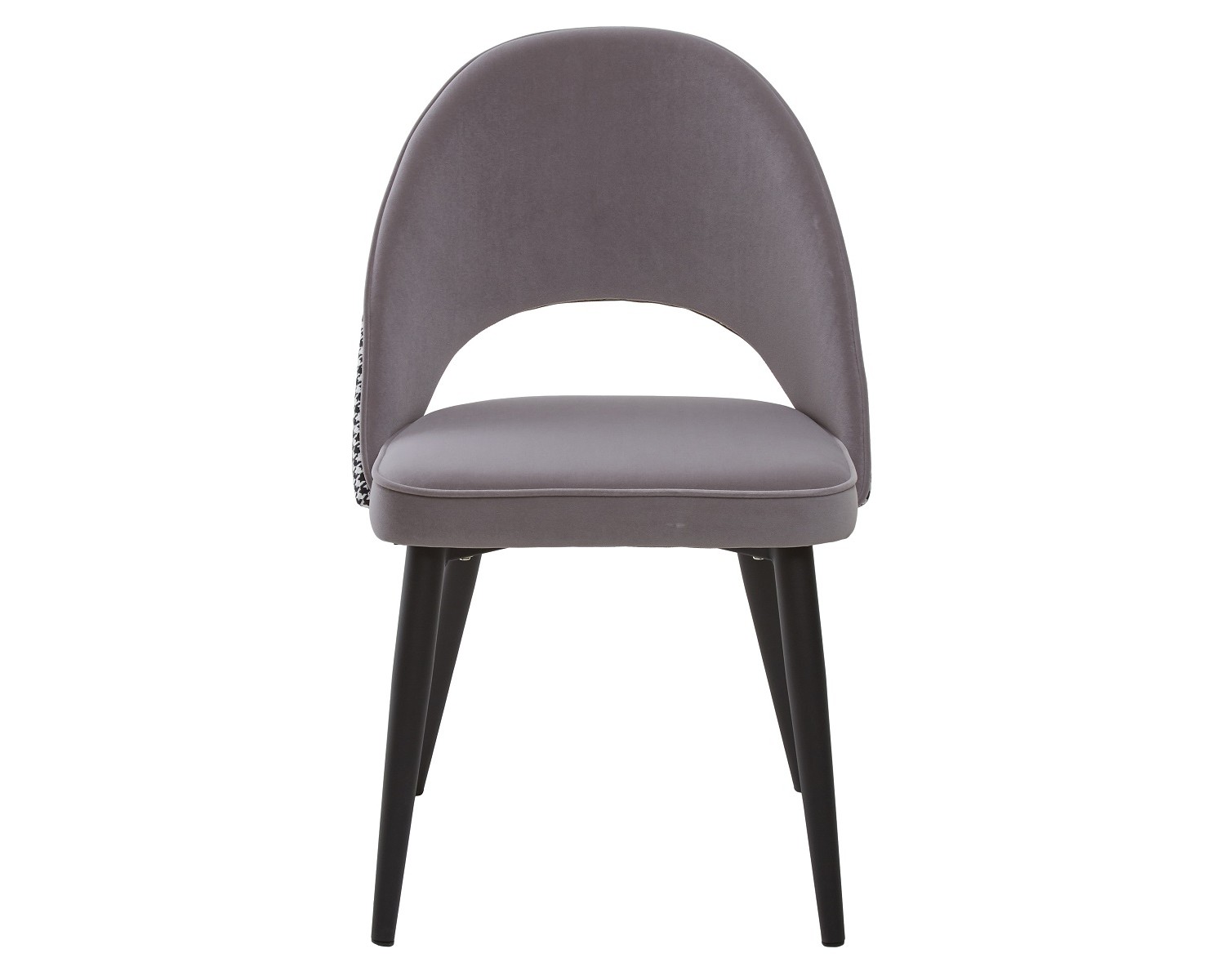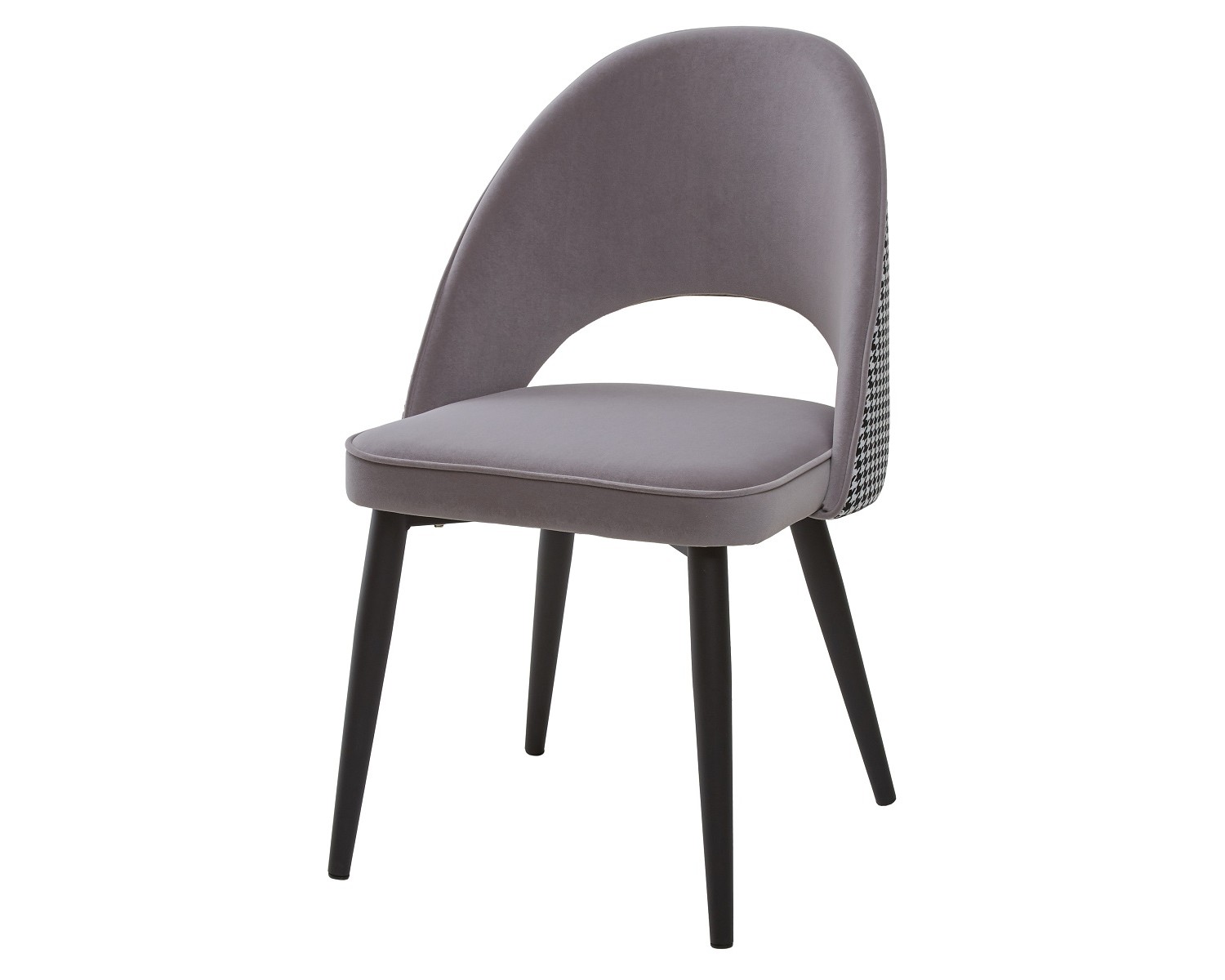 Сиденье обито велюром серого цвета с лицевой стороны и тканью с рисунком "гусиная лапка" в черно-белых тонах с задней стороны спинки.