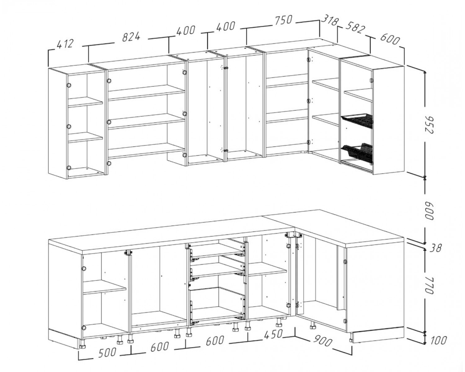 Высота верхних шкафов: 952 мм