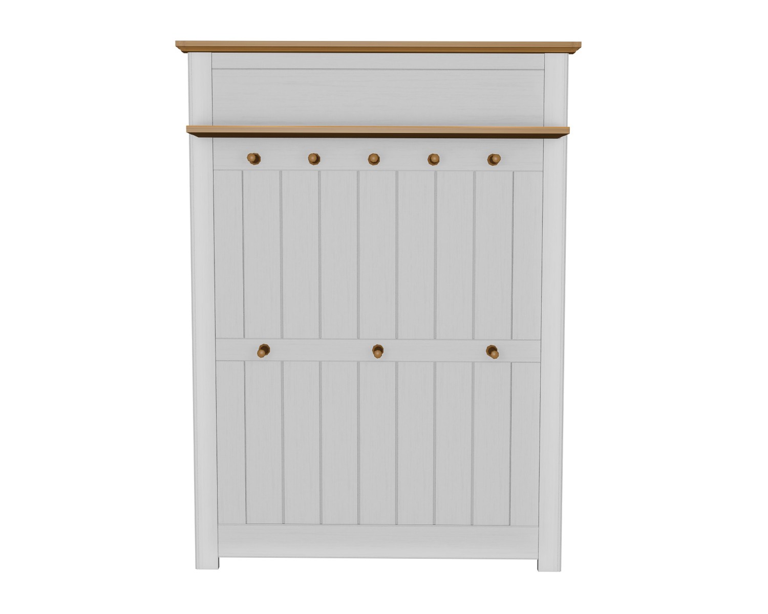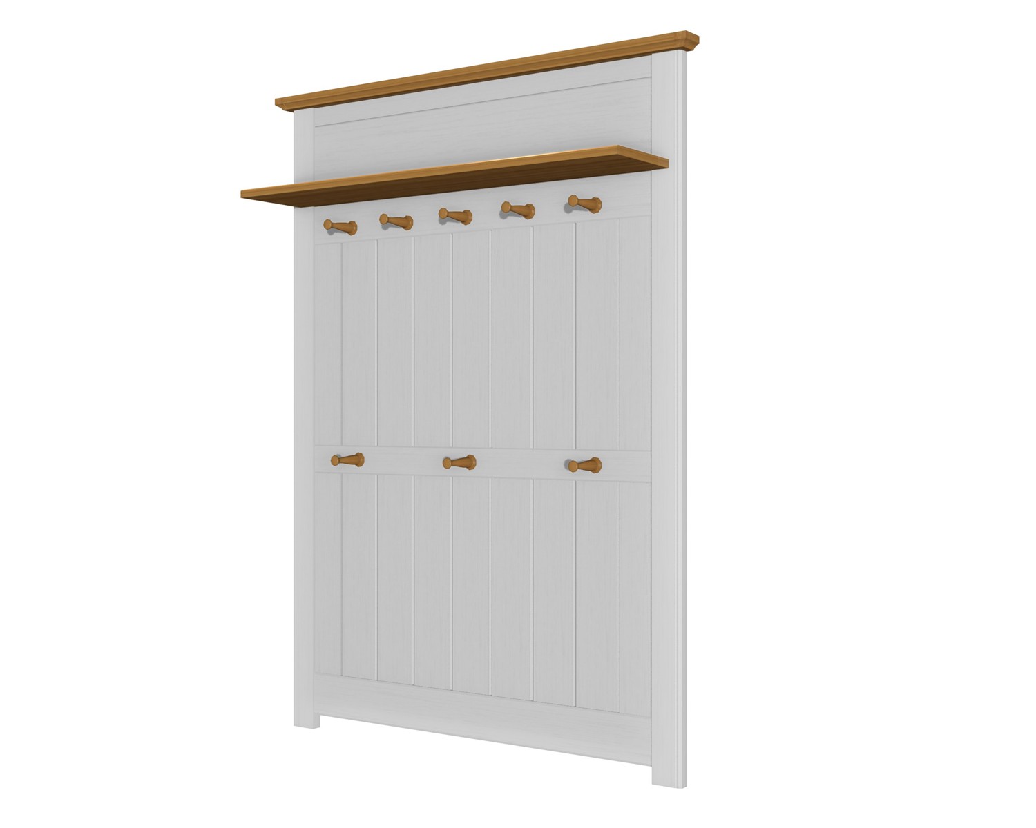 К панели крепятся 8 деревянных крючков для верхней одежды, сумок и зонтов, а также полка для головных уборов, варежек, перчаток. Панель вешалки выполнена в белом цвете, а карниз, крючки и шляпная полка в цвете антик. Другие варианты окрашивания: «серый/антик» и «черный/антик». Преимущество мебели «Пенни» – качественные гипоаллергенные лаки на водной основе от известного производителя Backer Acroma (Швеция). Панель вешалки декорирована вертикальной фрезеровкой.